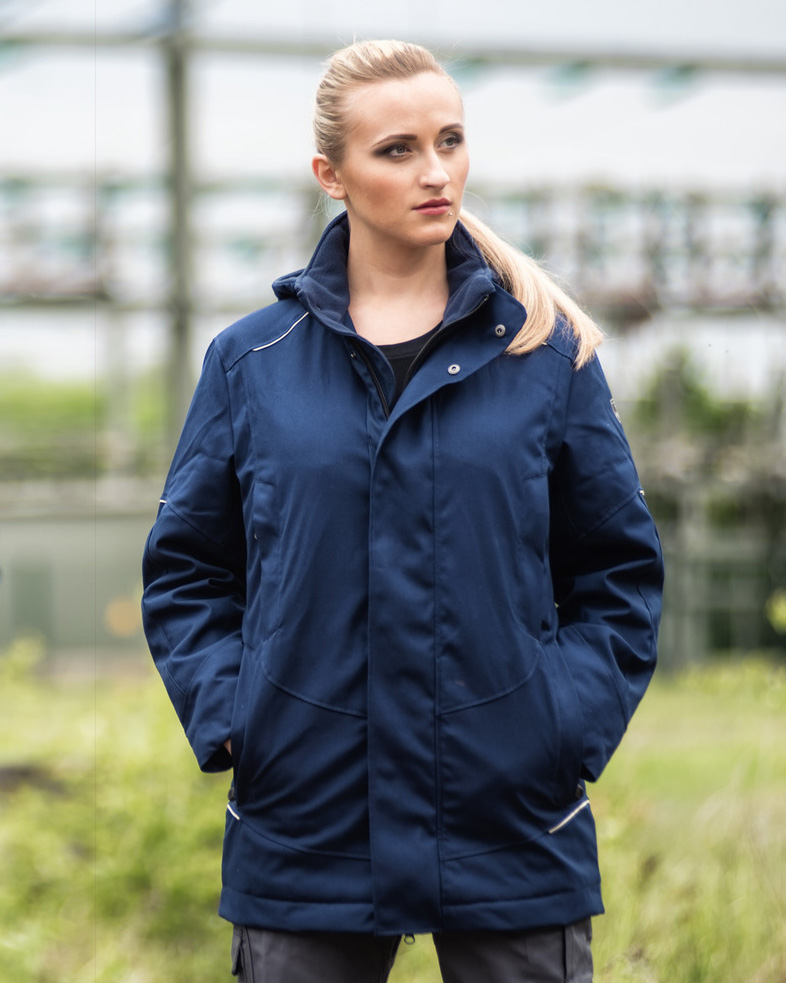 • Frontleiste mit Zwei-Wege-Reißverschluss und zusätzlichem Druckknopfverschluss (verdeckt)