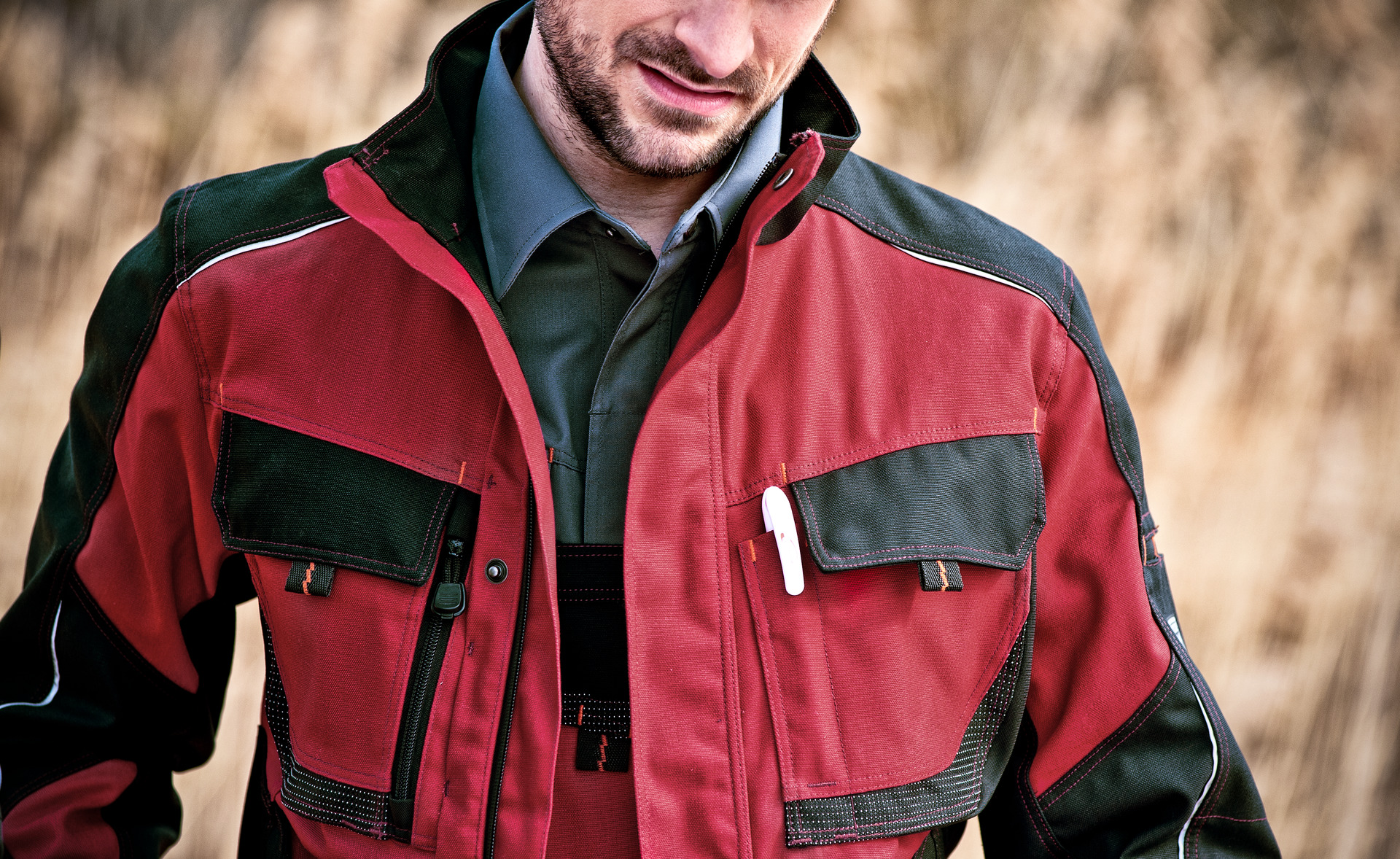 • Brusttasche rechts mit Patte, verdeckten Edelstahl-Druckknöpfen und Napoleontasche mit Reißverschluss